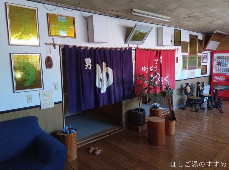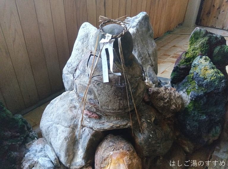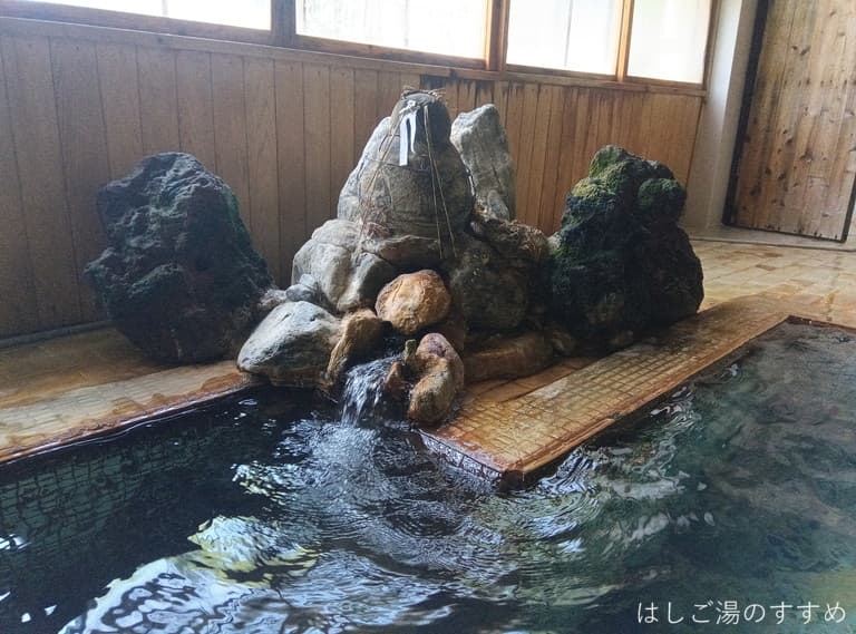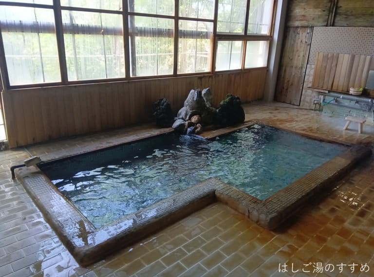 これとは別に浴槽上部と底に管の穴があったものの、ここから湯が出たり吸い込んだりしている形跡はありませんでした。湯使いは謎ですが、塩素臭は感じられず。つるつるした浴感の無色透明湯は、ややなまり気味でしたが、まずまず楽しめました。