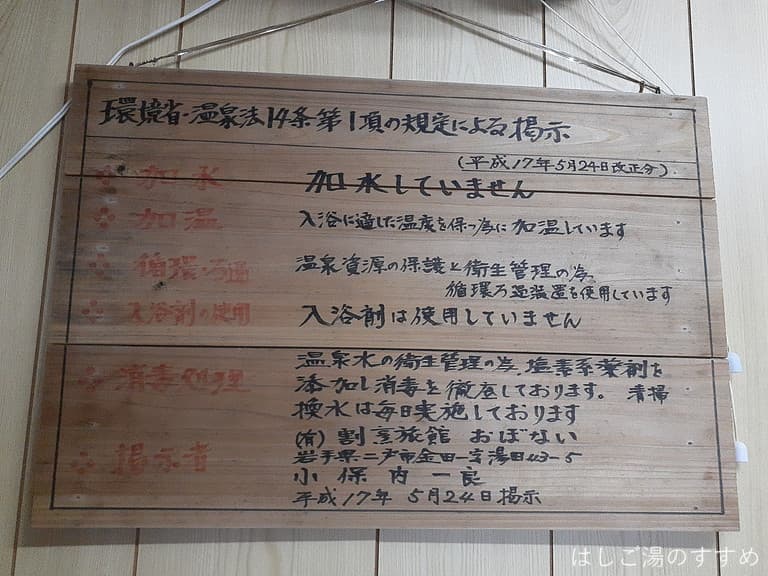 金田一温泉(玉の湯)単純温泉 33.4℃ pH=8.0 溶存物質計=0.721g Li=0.1mg Na=183(91.19mv%) K=7.0 Mg=2.0 Ca=8.5 F=5.2 Cl=28 SO4=50 HCO3=400(74.89) CO3=3.0 Br=0.1 I=0.3 H2SiO3=30 HBO2=3.7 CO2=6.7 (H21.11.19) ※温泉利用状況=加温あり・循環ろ過あり・塩素系薬剤使用あり・毎日換水