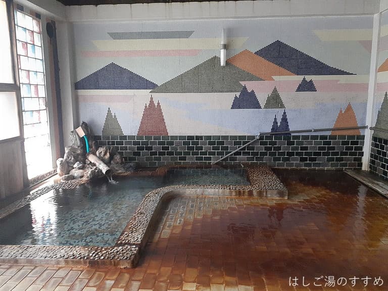 廊下を奥へ奥へと進むと浴場の「長寿の湯」がありました。広い浴室空間に味のあるタイル造り浴槽があります。壁には山々を模したタイル絵が施されて見るも楽しめました。