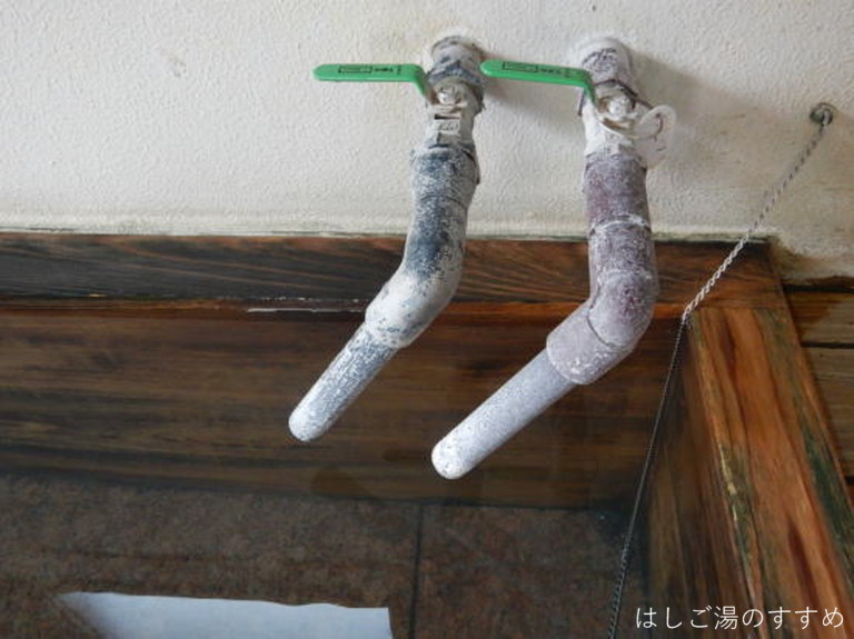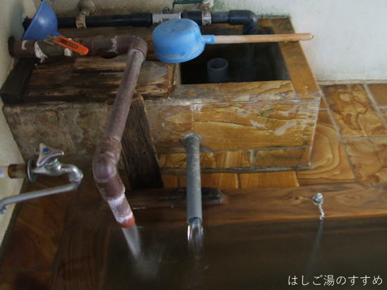 浴室床は天草陶石というキレイな石が敷かれていて、目にも鮮やかです。こんな石を浴室床に利用しているのは初めてお目に掛かりました。浴槽は木造りの長方形のものです。浴槽の端にある塩ビ管より激熱の源泉が15L/min、と同時に水もほぼ同量が投入されています。加水量たくさんですが、高温源泉が多い別府の中でこの様なオーバーフローしている光景はあまり見かけない無いのでとても新鮮な光景でした。無色透明、噴気香りのするお湯。お湯どうこうより床石、木造り浴槽にノックアウトする。