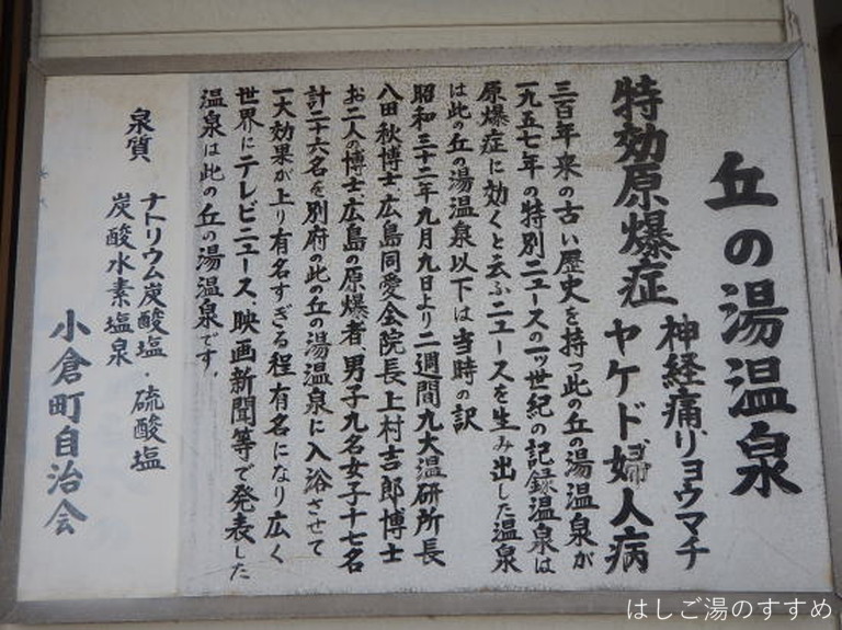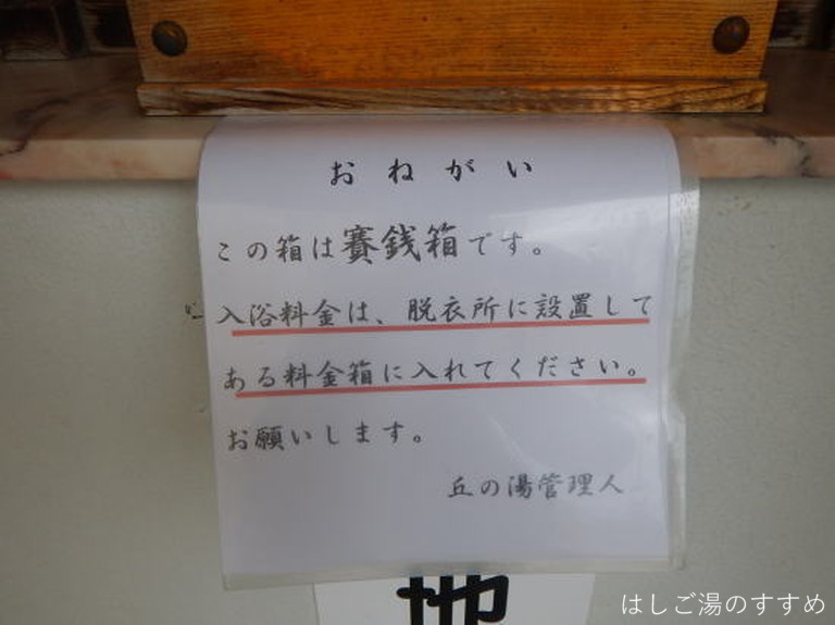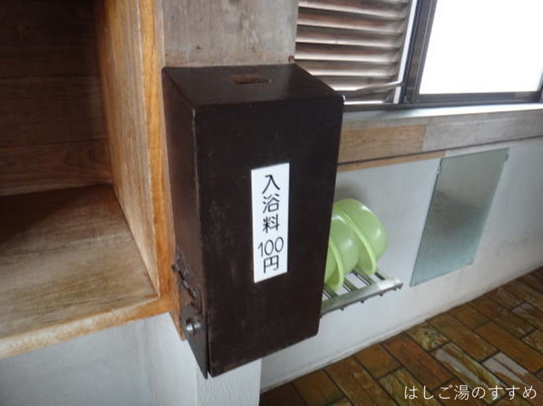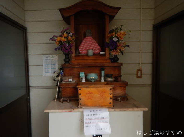 効能書きの「原爆症」が有名の神丘温泉の隣に位置する共同浴場です。浴場正面にはお薬師様。そこにはお賽銭箱があり、間違えてここに湯銭をチャリン。中に入ると料金箱が別にあり、仕方ないのでもう一度チャリン。