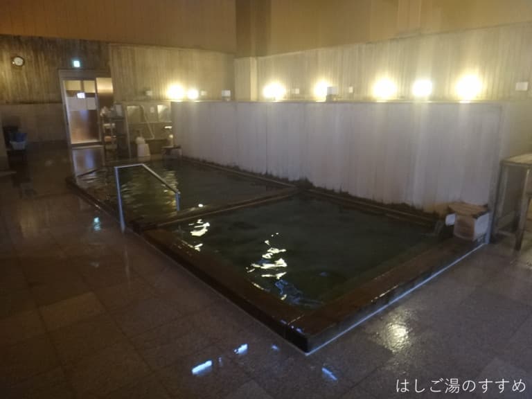 木材をふんだんに使用した館内には、夜祭のように提灯が並び駄菓子が並んでいます。こういう昔ながらの和風が、この施設のテーマのようです。浴室は男女別に内湯+露天風呂という構成。先ずは内湯ですが、5~6人(やや熱め)+10人(適温)に仕切られた長方形浴槽があり、ごくわずかに黄色がかっても見えるほぼ無色透明湯が掛け流されています。ごくわずかな温泉臭の漂う湯は弱いスベ感があり、湯口ではタマゴガス臭が香ります。内湯には、その他に寝湯、サウナなどがありいろいろ楽しめます。ただ朝風呂タイムだったからかシャンプー・ボディソープは置かれていませんでした。