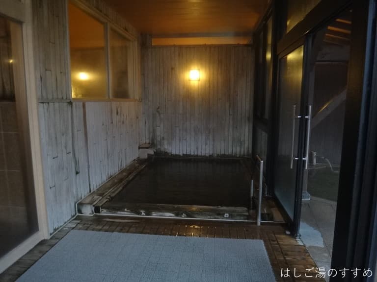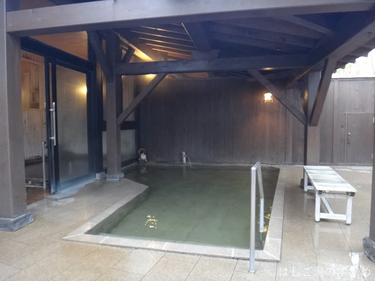 ガラス扉の向うの露天風呂へ移動します。周囲は目隠し塀に囲われた屋根あり石造り露天風呂、それに付帯する感じな内湯浴槽もありました。全体的にお湯は薄黄色づいた透明、温泉臭ありの弱つるスベ感。利用状況の確認が出来なかったが、公式HPによると「100%源泉掛け流しの天然温泉」とのみ記載がある。