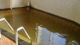番台を境に男女別浴室への入口がありました。木材を多用し落ち着いた雰囲気の浴室には6~7人サイズ浴槽がひとつあり、手前に向けて浴槽湯がサラサラと掛け流されているのが見えます。まずは体を洗ってそっと湯に浸かります。浴槽湯はほんのり茶色がかった透明でやや熱め設定、とてもアッサリした印象の加水掛け流し。湯口を確認するとぬるくなったり熱くなったりが頻繁に繰り返されていました。
