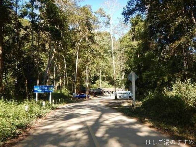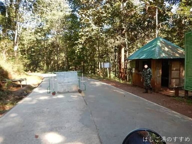 Googlemapを確認しながらサイ・ガーム温泉を目指します。サイ・ガーム温泉は自然保護公園内にあり、途中の料金所ゲートにて入域料一人200バーツとバイク一台20バーツの徴収がありました。ゲートを管理しているお兄さんたちに「この先は急坂があるのでバイクの走行は注意して」とのアドバイスをうけました。