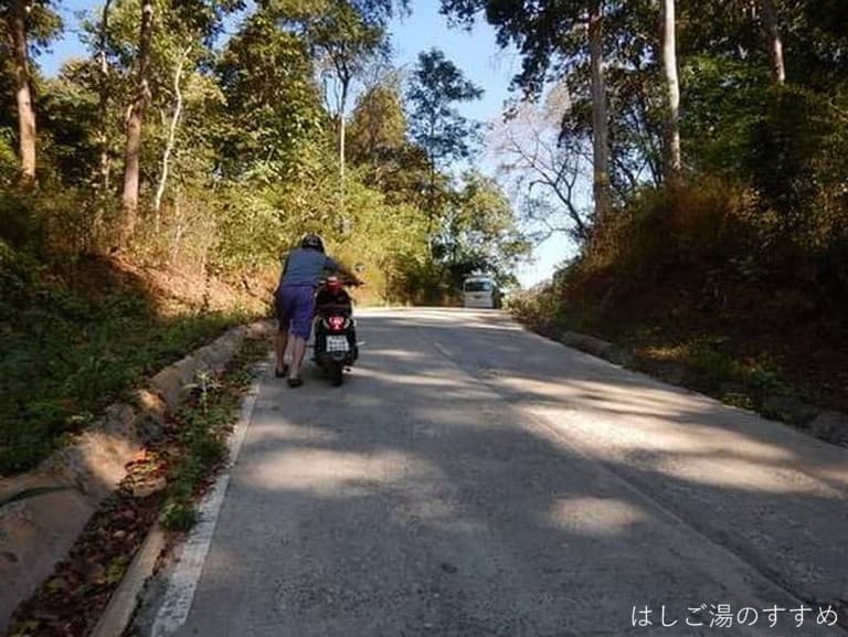 道路そのものは舗装されているので快適なのですが、お兄さんの言う通りその先にあった急坂がクセモノでした。日本では見たことないような激しい上り下りの急こう配です。我が家は110ccスクーター二人乗りだったのですが、あまりの急こう配と明らかにパワー不足のスクーターが重なり、登りきれずに失速してスクーターごと転倒という事態に。この時はヘルメットのおかげで頭が守られましたが、手や足に擦り傷が数か所できてしまいました。(後日この傷を人懐っこい犬に舐められて狂犬病の注射を打つ羽目になりました)