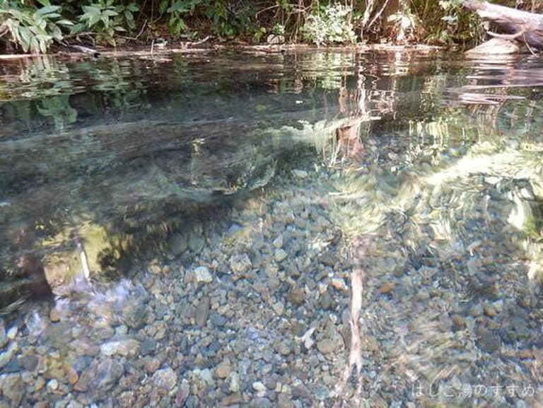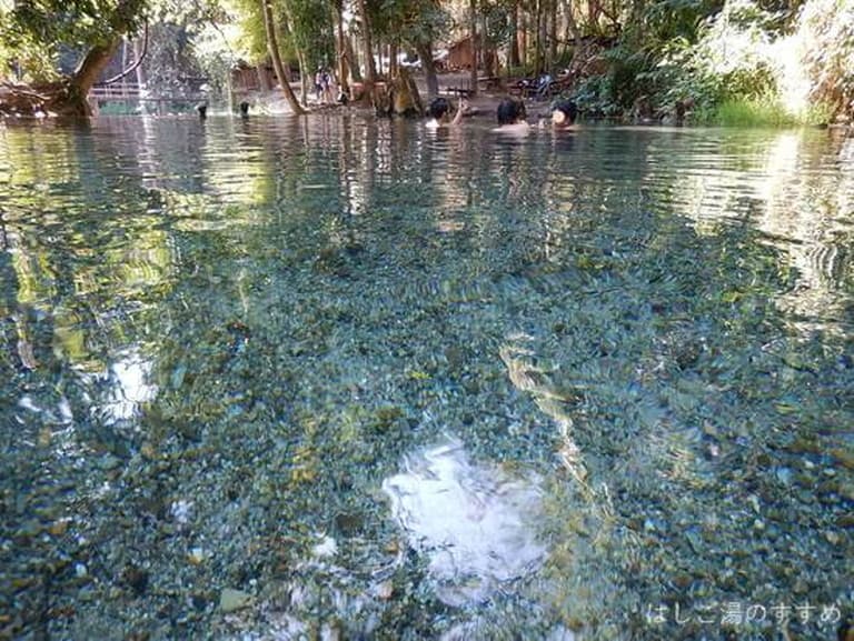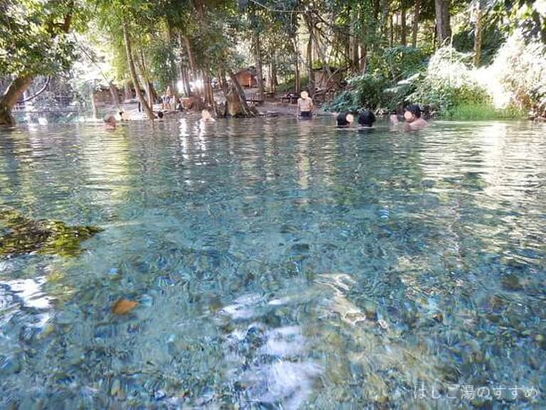 サイ・ガーム温泉は緑に囲まれた環境の中にちょっとした川が流れていました。温泉は川底のあちこちから湧出する足元湧出泉です。場所によって「ぬるめの適温~人肌程度~ややヒンヤリ」で、好みの湯温ポイントを見つけて湯浴みをします。川湯は柔らかな砂地になっていて、歩いてもほとんど砂や泥が舞い上がりません。そのためなのか全体的に濁りのない無色透明で、温泉に浸かりながら川面を見ていると、鏡のような水の中に沈む木や石がハッキリと見え神秘的ですらあります。温泉は川の水も入り混じるので源泉100%ではないですが、そんなものはどうでもいいくらいの快適さで、あまり長湯しない我が家ですが気が付けば2時間ほど湯浴みをしてしまいました。