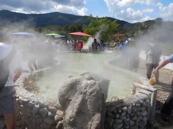 旅行者のの間ではすっかり有名観光地となっているサイ・ガーム温泉なので、当日の入浴者はタイ人半分、欧米系旅行者半分といったところでしょうか。居合わせた他のお客さんんにカメラを渡して記念撮影をしてもらったり、お互いをとりっこしたり、一緒にセルフィしたり、観光地ならではの楽しさもある野湯でした。