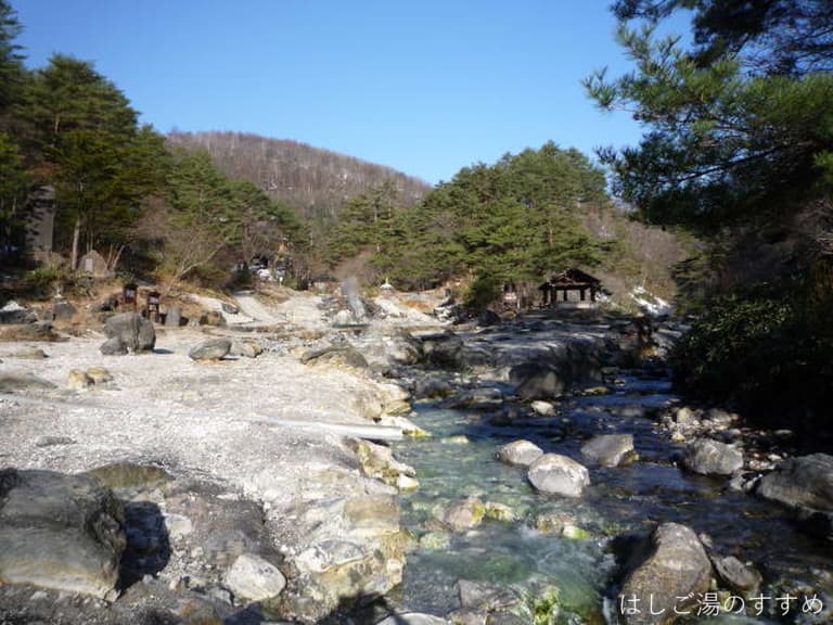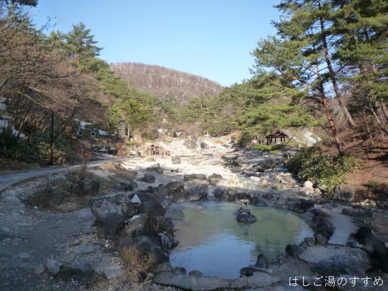 肝心の湯は無色透明な中に白い粉状湯花も浮遊するもので、草津らしいヌルスベとした浴感があります。浸かってみると万代鉱独特の甘ったるい香りが漂います。てっきり「西ノ河原源泉」を利用しているのかと思っていたのですが、実際は「万代鉱」でした。湯温は草津にしてはぬるめの適温で、こなれ気味という事もあり、随分と浸かりやすい湯になっています。草津ならではの熱くキリッとした湯を求めると肩透かしにあいますが、万人がストレス無く浸かれる湯で、これはこれでいいんじゃないかな。訪問時はぬけるような晴天の青空の下、清々しい朝風呂を楽しむ事ができました。