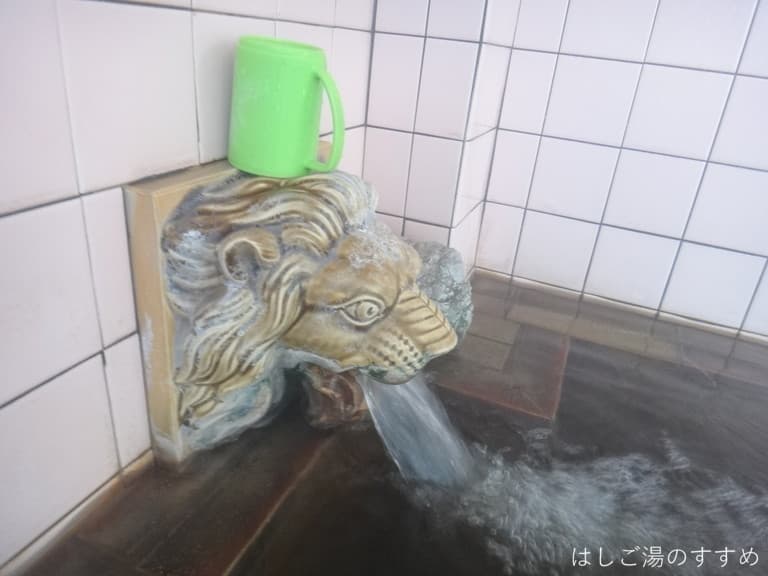 浴室には奥から、3人(熱め)・4人(ぬるめ)・5人(適温)サイズの三浴槽がL字型に並び、ほんのり茶色がかった透明湯がザコザコと掛け流しされています。重曹のようなもったりとした味と香りのする湯で、ヌルスベとした肌触りがあり、早い時間帯に訪問したからか湯の状態も大変良く、かなり満足度が高いです。せっかくなので全ての浴槽に浸かってみましたが、やはりというか、ここでもあまり浸かる人がいない「熱め槽」が一番鮮度が良い印象でした。