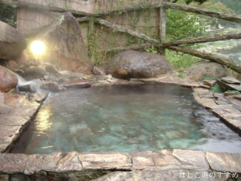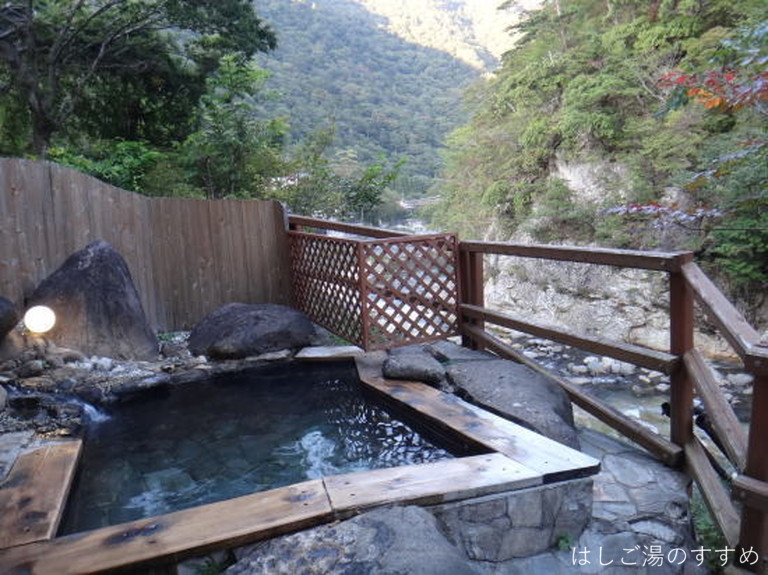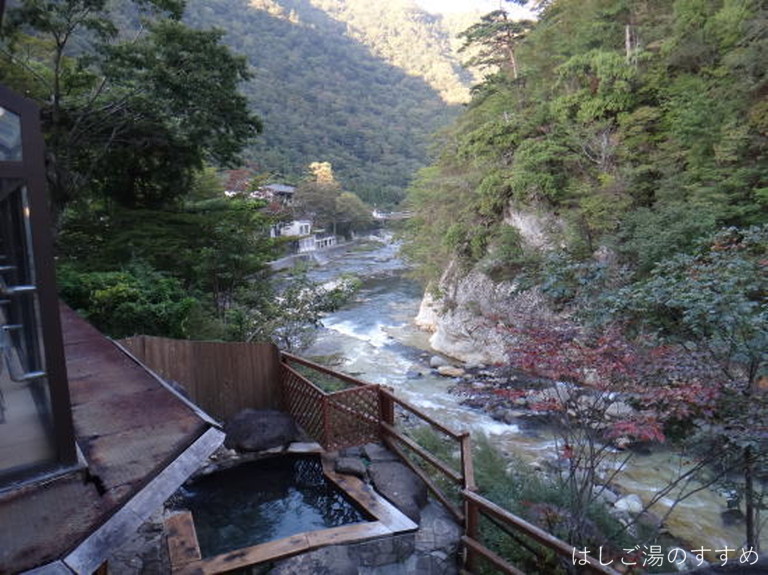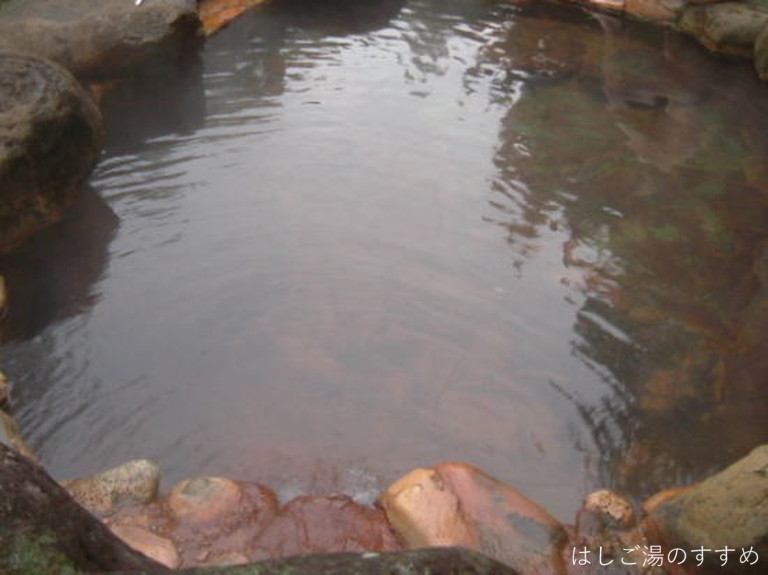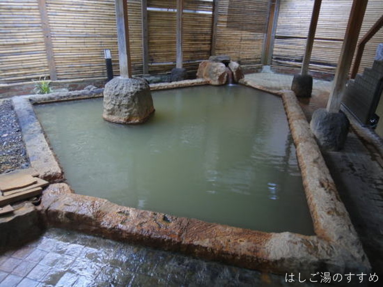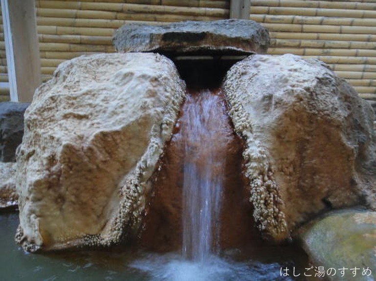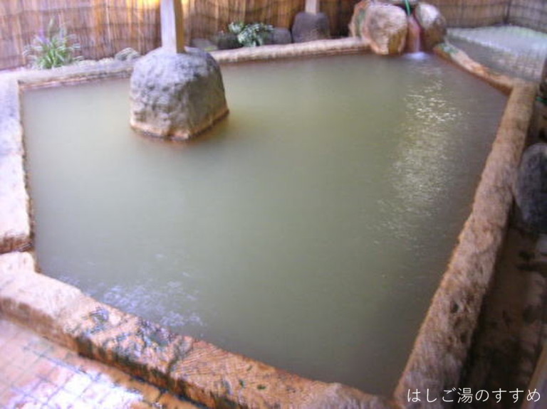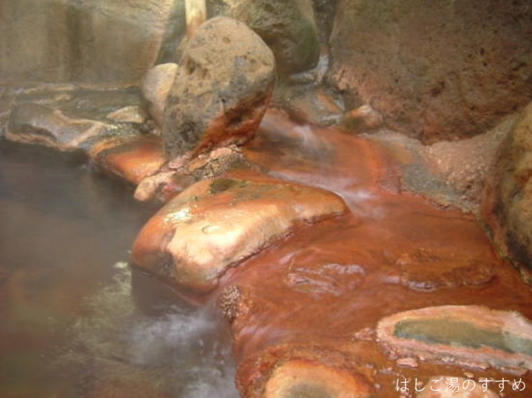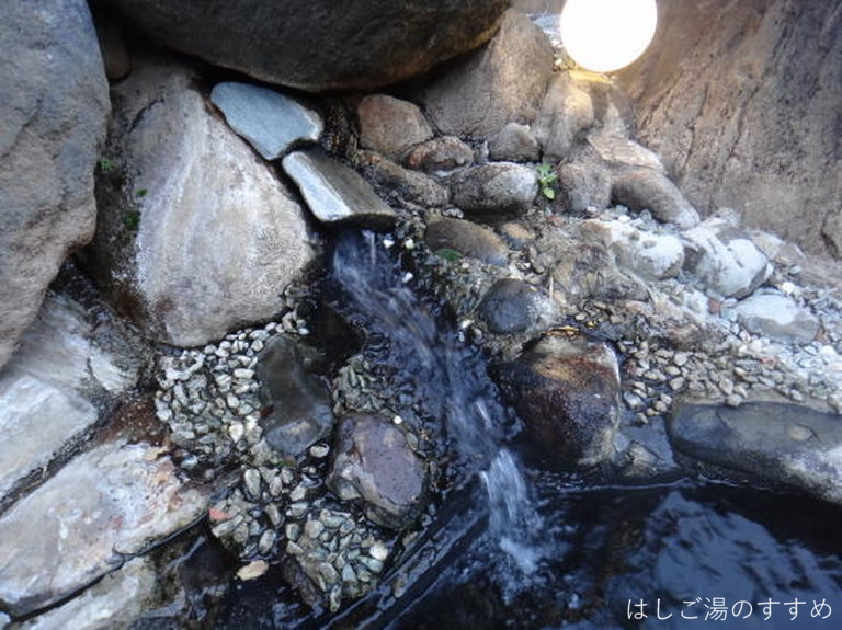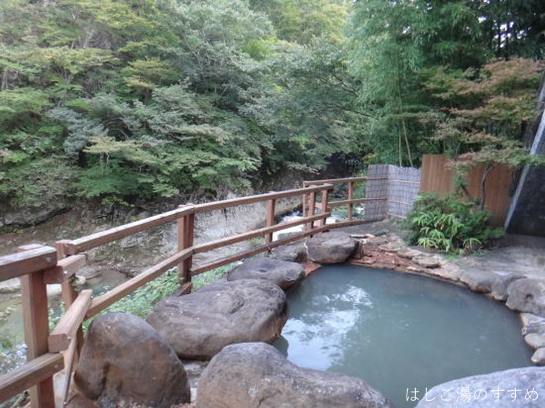 訪問時の男性浴室は「内湯大浴場・四季の湯」「露天風呂・かじかの湯」。やはりここは「露天風呂・かじかの湯」が良い。かじかの湯と言っても一の湯&二の湯の二種類の浴槽がある。それぞれ利用源泉が異なっている。一の湯は内湯と同じ源泉ですが、内湯とは違い掛け流しで利用されている。二の湯は食塩泉を引いており、こちらも掛け流し利用。岩や石を用いて造られた露天浴槽は開放感がありとても良い風呂となっている。川沿いの高台にあり、対岸の木々などの眺望も素晴らしい。湯は表面が薄っすらと白っぽく見える。塩味に重曹甘味、そして新鮮な金気味がある。土類成分の影響かギッチギッチした浴感が特徴的。湯口周辺は析出にて赤茶に変色、およそ50L/minは掛け流しており満足できる湯である。ホースにて少量ながらの加水があった。