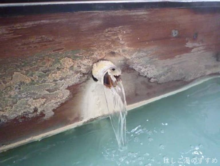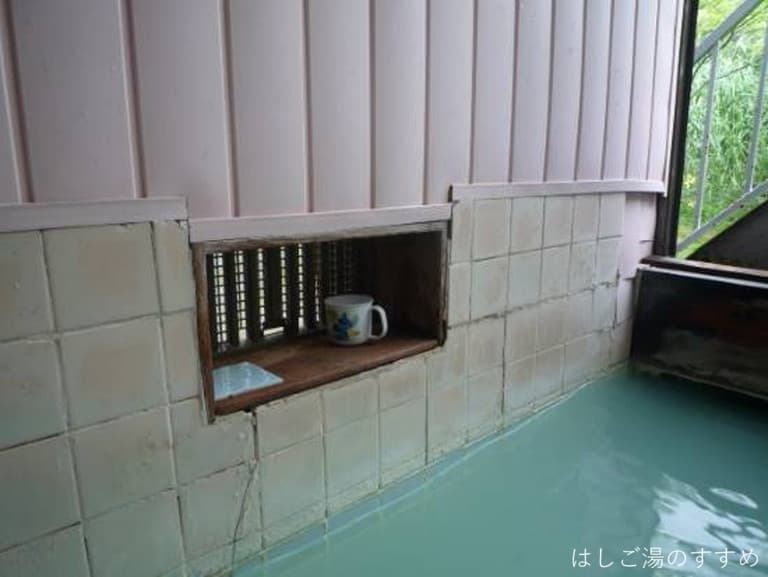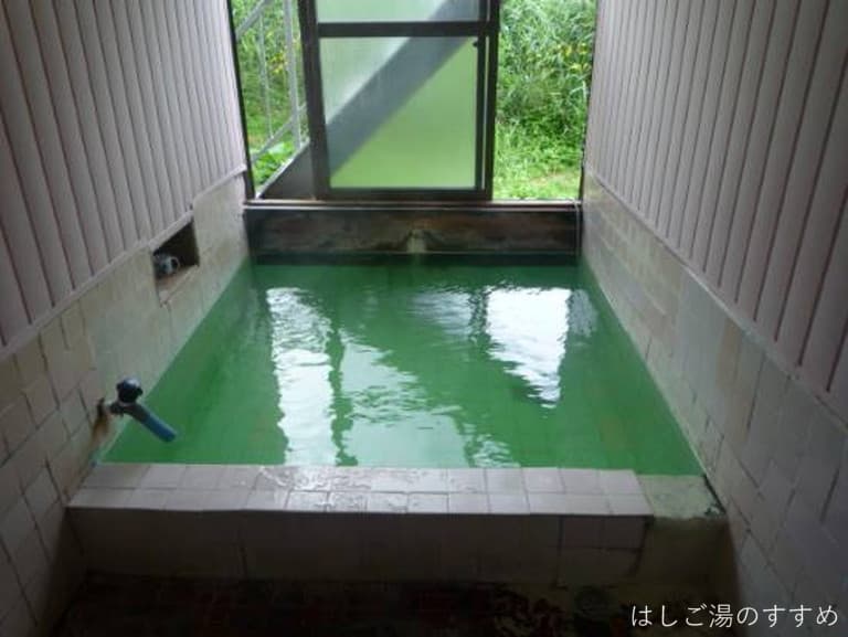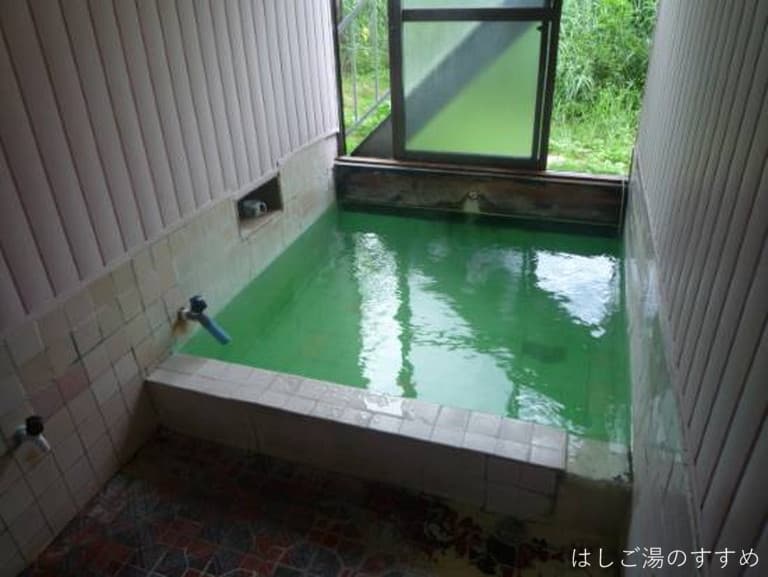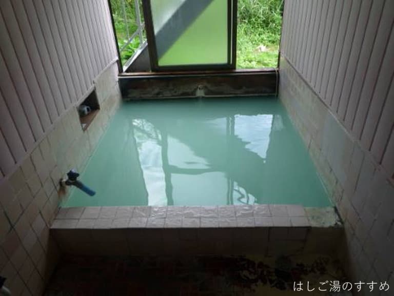 窓が開放された外光明るい浴室には、2人サイズ(つめて3人)の四角い浴槽がひとつあり、綺麗に澄んだ緑色の湯がサラサラと掛け流されています。ただ、この湯がとにかく熱いんです。あまりの熱さに必要最低限の加水と湯揉みをしたのですが、その影響で湯が緑がかった乳白色へと変貌(以前、野沢温泉でも同じ現象を見た)。浴槽サイズにして源泉投入量が多く、温泉マニア的には嬉しいです。スベとした肌触りのタマゴガス臭がプンプン香る浴感の強い湯は、万人誰もがイメージする最も温泉らしい温泉と思います。