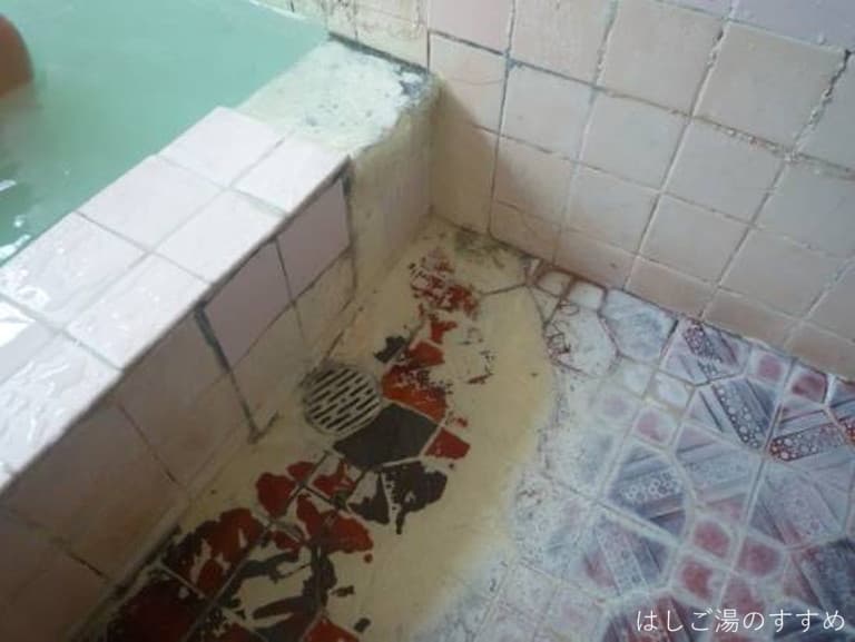 浴槽は青角タイル張り、2人でゆったりサイズの広さ。硫化水素ガス対策で浴槽脇には換気窓が設置されている。暫くは誰の利用も無かったのか、浴槽湯は激熱で加水せずして直ぐに浸かれる状態ではない。仕方なく適量を加水して入湯する。湯口の塩ビホースより激熱湯を10L/min程投入している。浴槽手前横の切り込みよりオーバーフローの掛け流し。加水したので湯には濁り発生する。緑白色濁り、苦エグ味に強タマゴ臭を放つ湯でした。