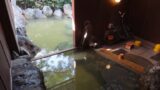 で、男女別内湯ですが、女性側に限っては湯の様子が違っていました。以前と同様に岩組み湯口より浴槽に見合った量の湯を投入しているのですが、既にたくさんの人が浸かった後なのか、湯が草臥れ、薄っすら白濁りが生じ、かなり「なまり気味」となっています。そして何故か浴槽からの溢れ出しが見られません。男性側からは相変わらず全面オーバーフローがあったとの事なので、女性側の湯が男性側に流れ込み排湯する構造になったのかな?