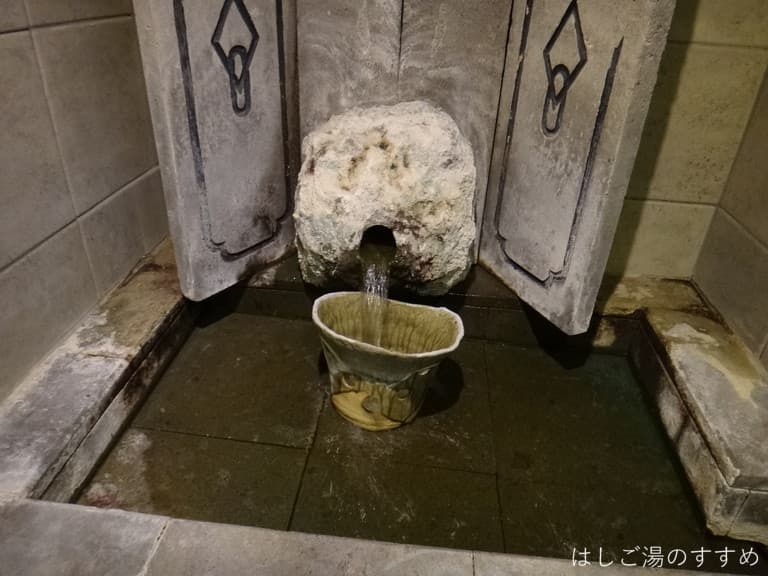 綺麗な館内には、男女別大浴場と別料金の貸し切り風呂があります。大浴場は脱衣所から明るく広々と綺麗で、温泉マニアではない一般の人も気持ちよく安心して利用できる雰囲気があります。脱衣所の一角には温泉と思われる「ぬるめ湯」が流れるオブジェがあり、塩素臭をムンムンと放っていました。