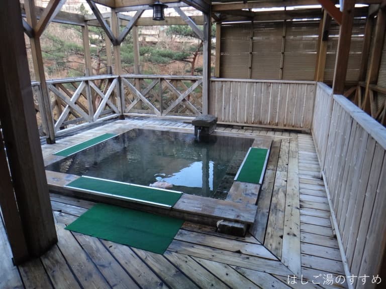 露天は屋根掛けは半分ほどされた造り。浴槽は木枠でモルタル造り、広さは5-6人でしょうか。無色透明、弱カルキ臭の湯。但し、湯口ではカルキ臭無しの源泉と思われる湯が浴槽投入されています。火照りも少ないサッパリする湯。