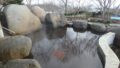 外は極寒だったがせっかくなので強風の中での露天風呂にも挑戦した。20人サイズの岩風呂、浴槽の深さが内湯と比べて幾分浅めの造りとなっている。露天入口に「天候の為、湯温調整が間に合わない」と掲示がありました。実際に浸かってみると湯温は37-38℃といった具合。湯口より加水源泉がドバドバ投入されているが、それでも氷点下の中での強風にはかなわなく「ぬるめ湯」状態でした。寒さに辛抱出来ずに内湯へ撤収。浴後はとにかく体が火照って汗が引かず困ってしまう程の凄い温まり様でした。