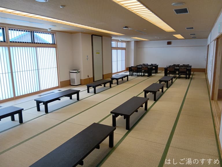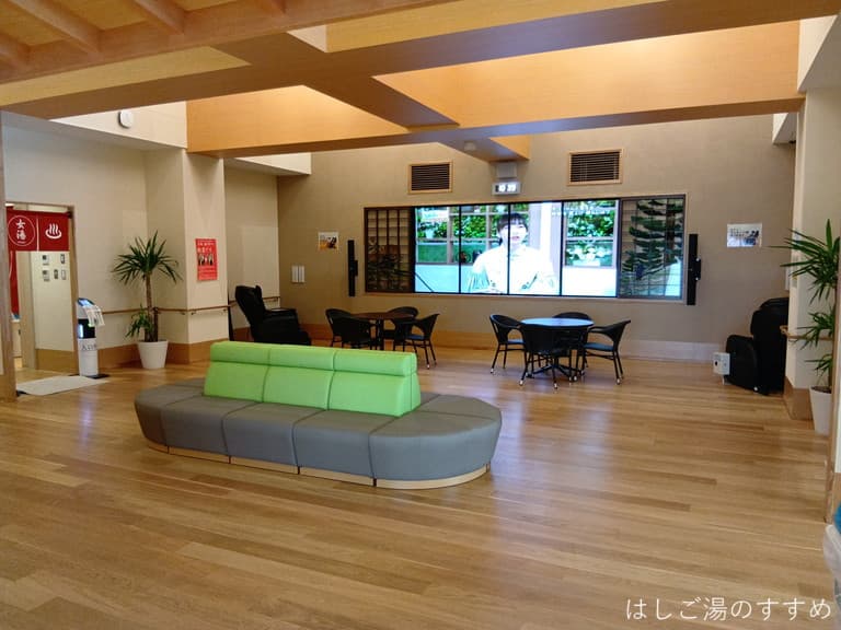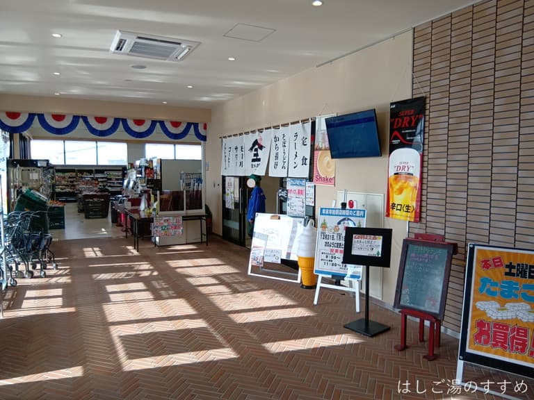 湯らぱ~くは建物が大きく立派で、館内に入ると食堂や商店、ジムも備えています。ジムはデイサービスのリハビリがメインのようですが、200円で一般利用できる時間帯もあるとのこと。