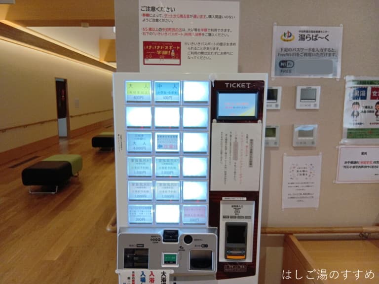 券売機でQRコードのついた入浴チケットを購入、それを男女浴場の入口ゲート読み取り部にかざして入場します。ゲート通過時に他のお客さんは牛の鳴き声の「モ~!」と音が出ますが、我が家の通過時は「ピッ!」と音が違うので「はて??」と思い、帰りに受付で訊いてみました。すると65歳以上の町民客は「モ~」、一般大人客は「ピッ」、子供は「ピヨピヨ」と鳴るそうです。